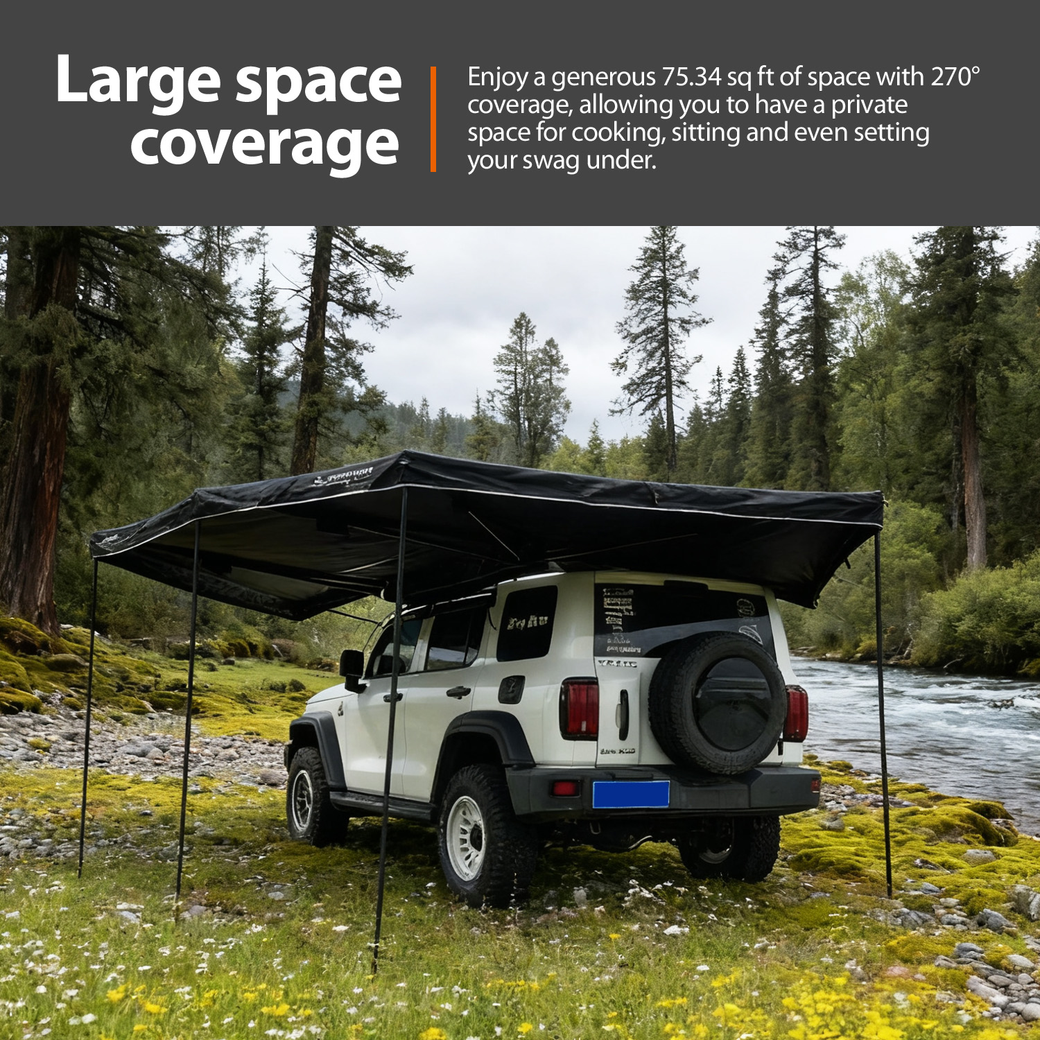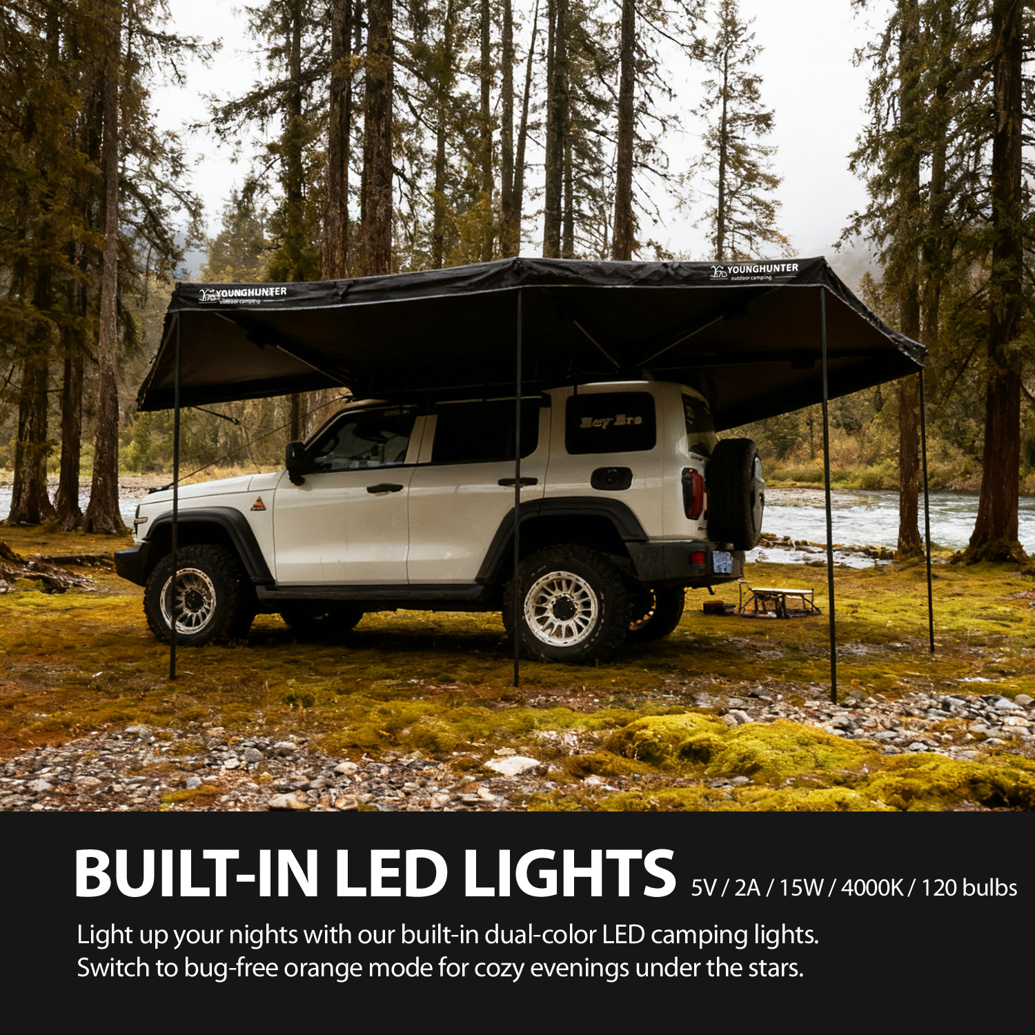 With 75.34 sq ft of full 360-degree shaded coverage, this foxwing awning tent provides ample space for outdoor cooking, seating, or setting up a swag—meeting the multi-scene needs of family campers, off-road groups, and event attendees. A standout utility feature is the built-in dual-color LED lights (5V/2A, 4000K): bright white mode illuminates evening activities, while bug-repellent orange mode creates a cozy, pest-free gathering space. The lights support USB or cable plug power supply, letting users connect to portable power banks for on-the-go use. Universally compatible with all pioneer platforms and cross bars (via included L-shaped brackets), it requires no extra adapters—broadening your target audience to owners of most SUV models. Additionally, it supports optional side walls or extensions (sold separately), boosting perceived value and giving you more upsell opportunities to discerning buyers.