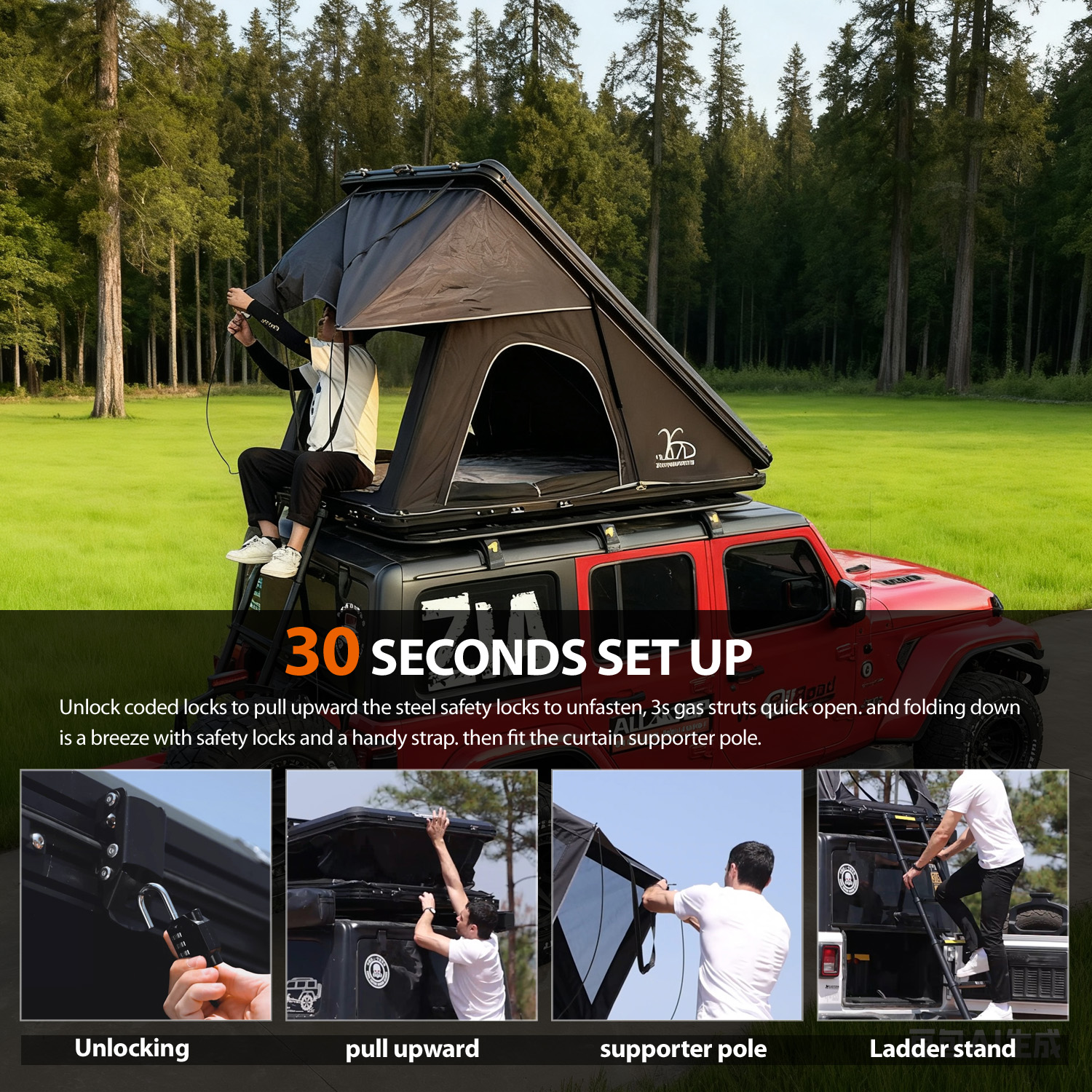 Speed is a top search priority for rooftop tent shoppers, and our RTT redefines hassle-free setup. No complex tools or lengthy assembly—just unlock the secure coded lock, lift to engage three heavy-duty gas struts, secure the curtain support pole, and deploy the ultra-light aluminum ladder. The entire process takes just 30 seconds, making it a favorite among weekend campers, festival-goers, and off-road enthusiasts. For B2B partners, this efficiency translates to stronger end-user satisfaction, fewer post-purchase inquiries, and higher repeat order rates—strengthening your brand’s reputation in the outdoor gear market.