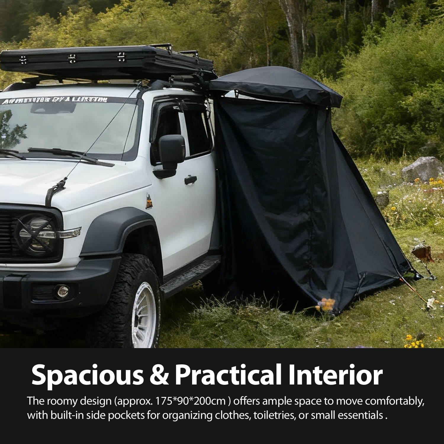 With a roomy 43.3"L×39.3"W×78.7"H interior, this shower tent offers ample space for comfortable movement during showering or changing—addressing a key pain point for outdoor enthusiasts. Built-in large side pockets add practical value, organizing power banks, toiletries, and gadgets to reduce clutter. Universally compatible with most car awnings (no extra adapters needed), it broadens your target audience to SUV owners, 4WD drivers, festival attendees, and beachgoers. The removable design enhances portability, making it easy to market to both casual campers and frequent travelers. As a high-value add-on to existing awning stock, it unlocks lucrative upsell opportunities, boosting your average order value and strengthening customer retention.