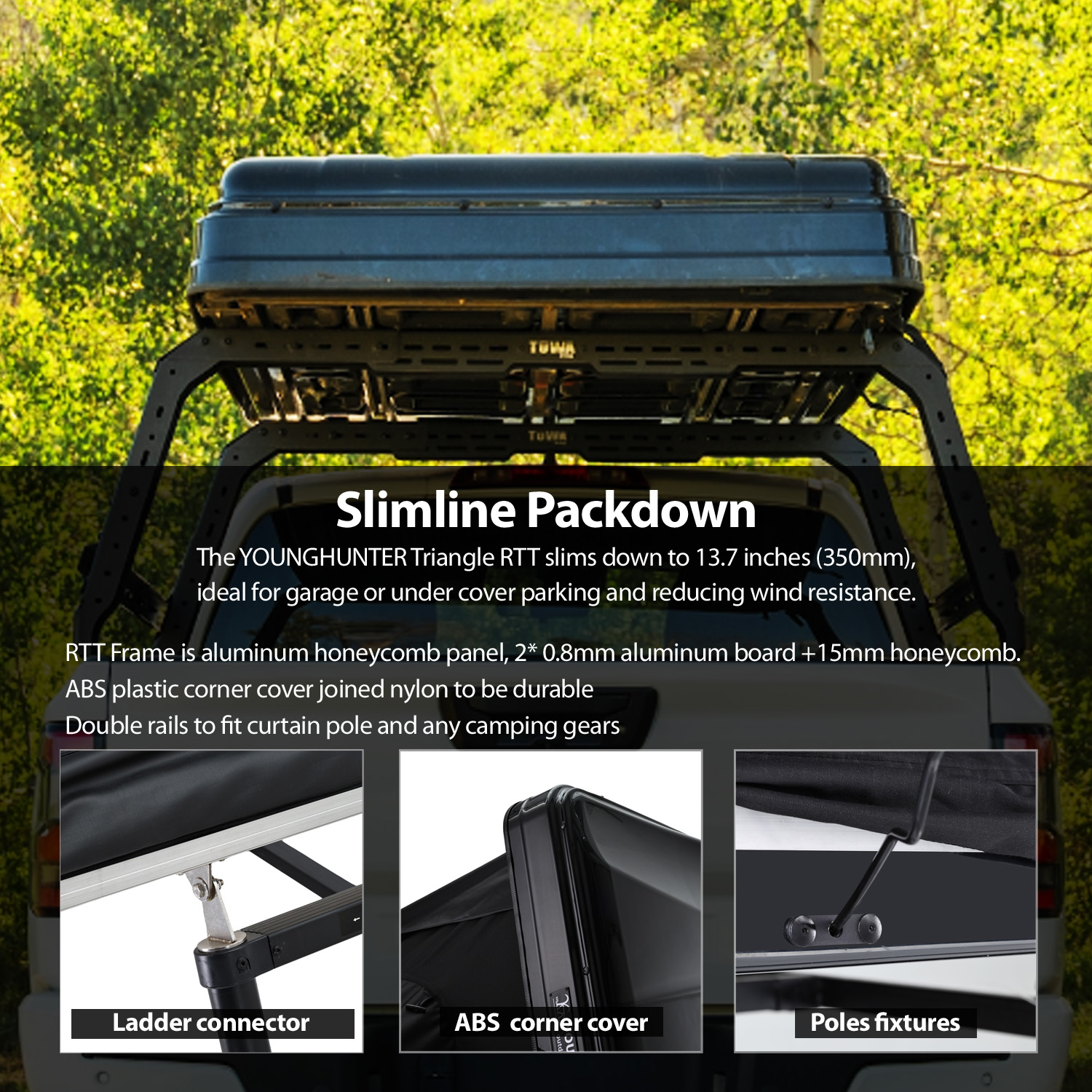 Bulk buyers prioritize durability above all—since it directly impacts warranty claims and profit margins. YOUNGHUNTER Rooftop Tent is built to withstand extreme weather conditions worldwide, making it a low-risk wholesale investment for your global supply chain. The tent body adopts a dual-layer fabric structure: outer 600D Oxford cloth (with 3000mm PU waterproof coating) + inner 280GS poly-cotton, delivering 3000mm water resistance (passing 24-hour continuous rain tests) and UV50+ protection (blocking 99% of harmful sunlight).